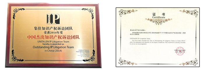 由《中國知識產權》雜志與中國日報知識產權頻道聯合主辦的“第五屆中國知識產權新年年會暨論壇”于2015年1月9日—10日在北京舉行,晚宴上對“第二屆中國杰出知識產權訴訟團隊”進行現場頒獎,集佳律師事務所繼2013年獲得該年度“中國杰出知識產權訴訟團隊”獎之后,再次憑借其五星級的業務能力、專業能力、研究能力以及團隊凝聚力,榮獲“2014年中國杰出知識產權訴訟團隊”獎。