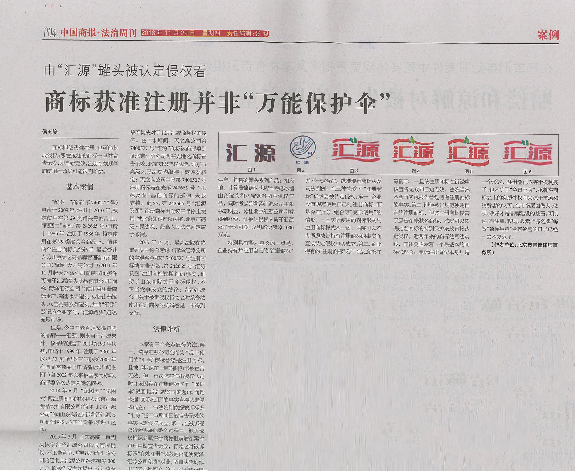 集佳文章《由“匯源”罐頭被認定侵權(quán)看商標獲準注冊并非“萬能保護傘”》在《中國商報》發(fā)表